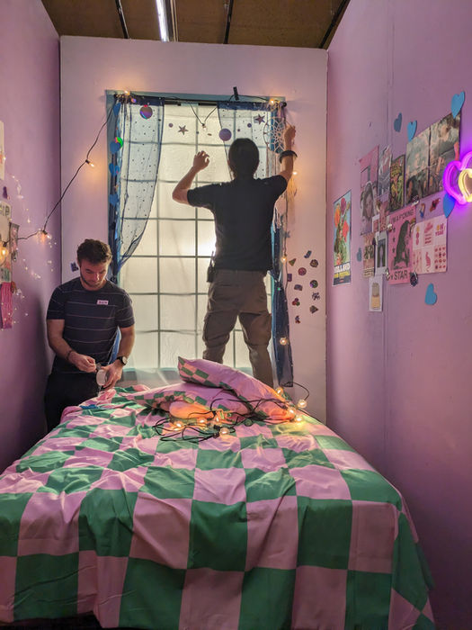 The set was furnished with cheap furniture from Facebook, painting them all pink and white to match the look. The color of the cushions on the actual set of the show is a distinct quality that everyone seemed to recognize about the show instantly so I retained that along with the fake plants in my design so that some of the elements on set match the TV look.